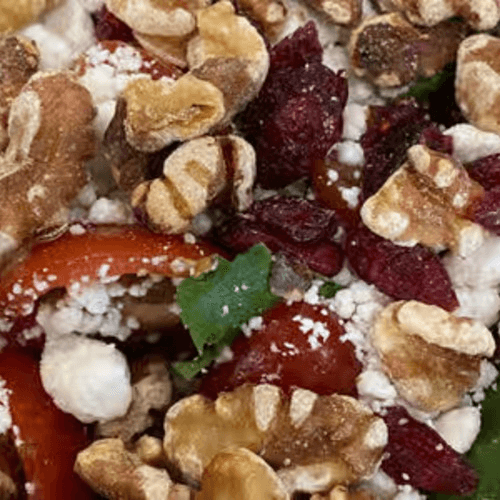Spring mix, walnuts, dried berries, goat cheese, with raspberry dressing