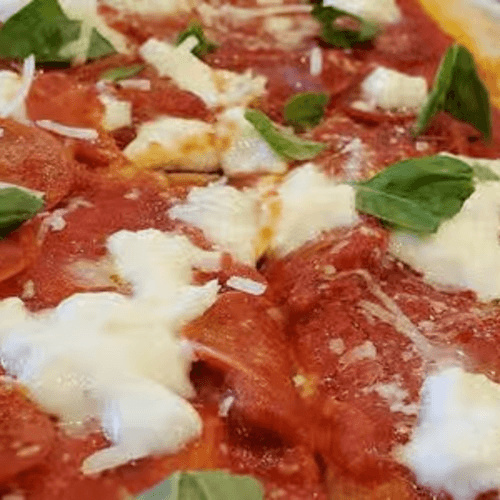 Fresh plum tomato sauce, homemade mozzarella, extra virgin olive oil & fresh basil